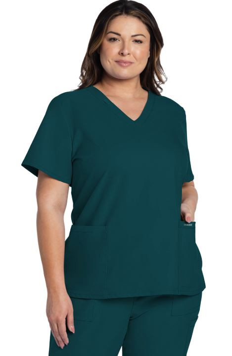 A v-neck top with built-in functionality elevates basic v-neck styling. There is a dyed-to-match flat bungee on the neckband for an ID badge loop. There are two roomy patch pockets with a reverse hem trim. Side vents at hem for ease of movement. Decorative tonal topstitching adds the finishing touch to this scrub top. Modern Classic fit. Center back length: 26"
