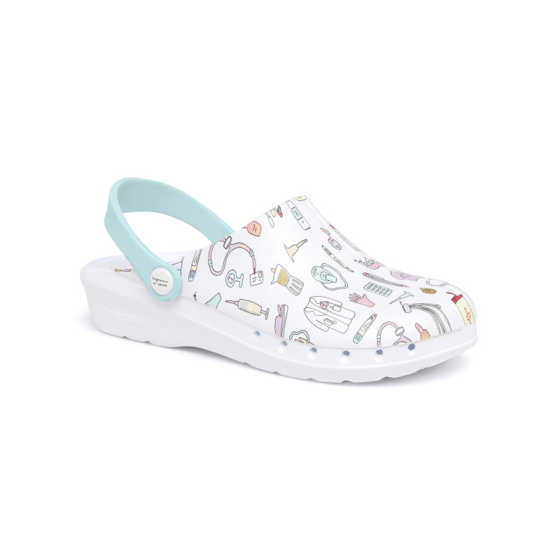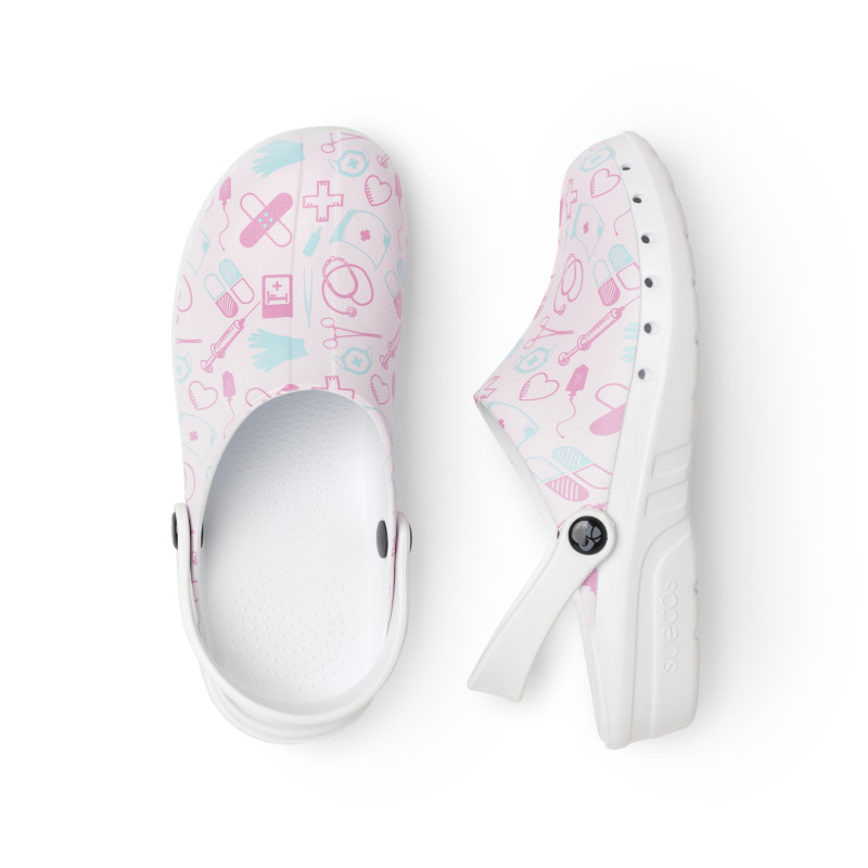Featuring a secure rear strap and a textured insole that promotes circulation, Oden Print is perfect for professionals who need long-lasting comfort. The slip-resistant, latex-free EVA sole ensures safety, while the antimicrobial and waterproof material maintains hygiene. These clogs are lightweight, flexible, and sterilizable with cold methods, such as UV light and hydrogen peroxide.